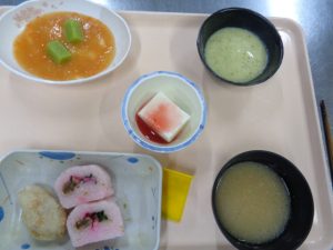 柔らかい食事を食べる人には、海苔は、くっつきやすいので使いません。柔らかく炊いたおかゆにゼリーをつなぎにして、桜でんぶで色付けしました。